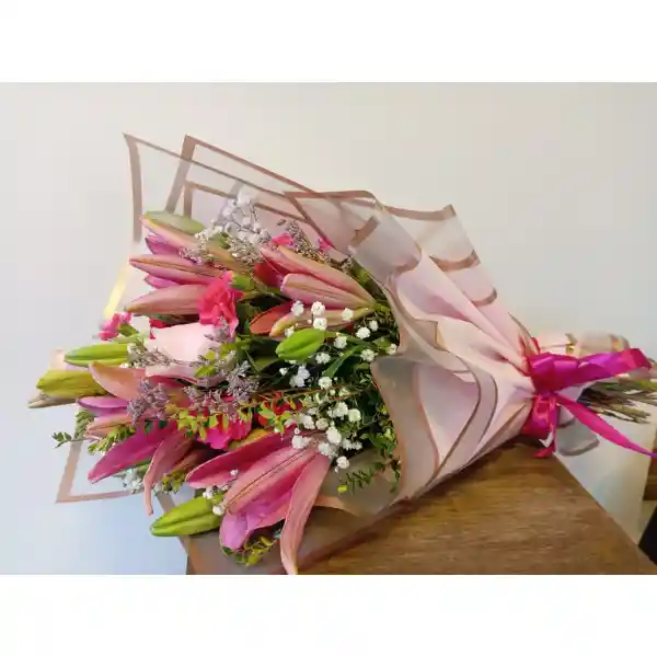 hermoso arreglo de 6 lilium con gypsophila y papel