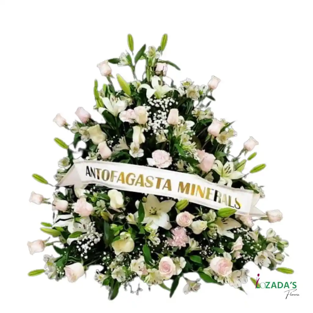 🕊️ Un tributo elegante y respetuoso 🌸 Este fino arreglo floral en tonos suaves transmite serenidad, respeto y acompañamiento en momentos de duelo. Diseñado con rosas rosadas, lirios blancos, alstroemerias y gypsophila, armonizados en una estructura simétrica con cinta personalizada, es una opción ideal para expresar condolencias a nombre de una empresa, institución o grupo familiar. 🌼 Composición: Rosas pastel, lirios blancos, claveles, alstroemerias, gypsophila y follaje. 📐 Altura aproximada: 70 cm 🎗️ Incluye cinta personalizada con nombre o dedicatoria. 🤍 Significado: Paz, ternura y memoria. 📍Disponible para entregas en Santiago de Chile. 💬 “Que la paz de las flores acompañe su recuerdo para siempre.”