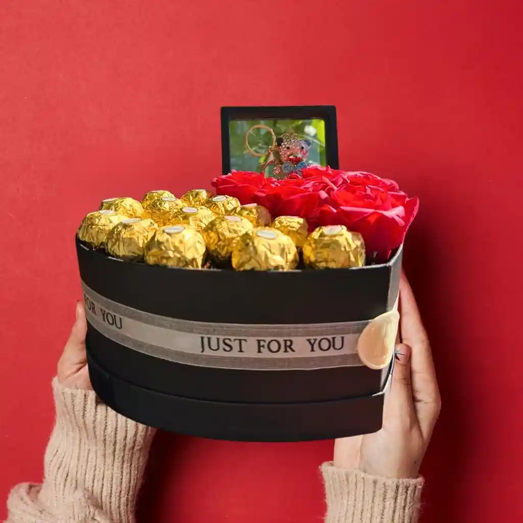 ¡Sorprende con este arreglo único, diseñado para esa fecha especial! Nuestra caja de corazón negra, envuelta en una cinta con el mensaje Just For You, es el contenedor perfecto para una experiencia de amor y lujo. Dentro, encontrarás 14 deliciosos bombones Ferrero Rocher, acompañados de hermosas flores preservadas rojas que agregarán un toque de amor y cariño. Pero eso no es todo. Nuestro arreglo incluye un llavero de fantasy con cristales de moda en forma de oso, un detalle que hará que tu regalo sea aún más especial y memorable. No te pierdas la oportunidad de demostrar lo especial que esa persona es para ti con este arreglo exclusivo. ¡Haz que este día sea inolvidable!