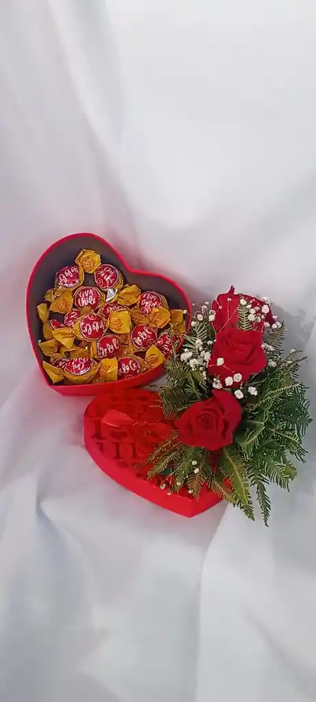 Este es un arreglo floral en una caja la cual tiene forma de corazon, en el justo en su tapa vienen 3 rosas arregladas y dentro de ella viene 15 bon o bon.