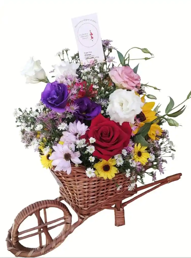 "Un regalo que enamora desde el primer vistazo y que florece mas allá del momento" Este regalo lleno de encanto rústico y romanticismo es un hermoso arreglo floral sobre una canasta de mimbre con forma de carretilla creada por una artesana de Chimbarongo, se convirtiérte en un detalle único, decorativo y lleno de vida. Contiene una armoniosa combinación de girasoles que iluminan con su energía, rosas rojas importadas símbolo de amor profundo, margaritas blancas y flores de estación multicolor que aportan dulzura y calidez complementado con follaje fresco que resalta cada flor. Ideal para sorprender en aniversarios, cumpleaños o simplemente para rellenar de flores un rincón especial. Presentación original reutilizable como decoración. Incluye tarjeta dedicatoria.
