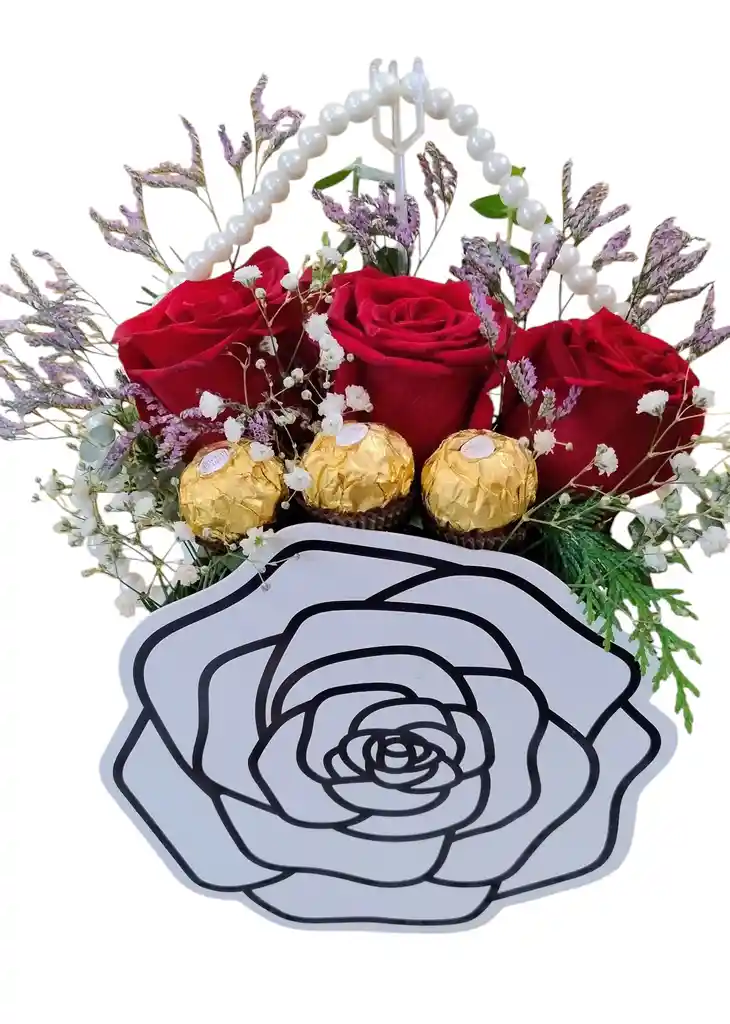 Linda cartera con arreglo floral de 3 rosas, follajes y bombones Ferrero