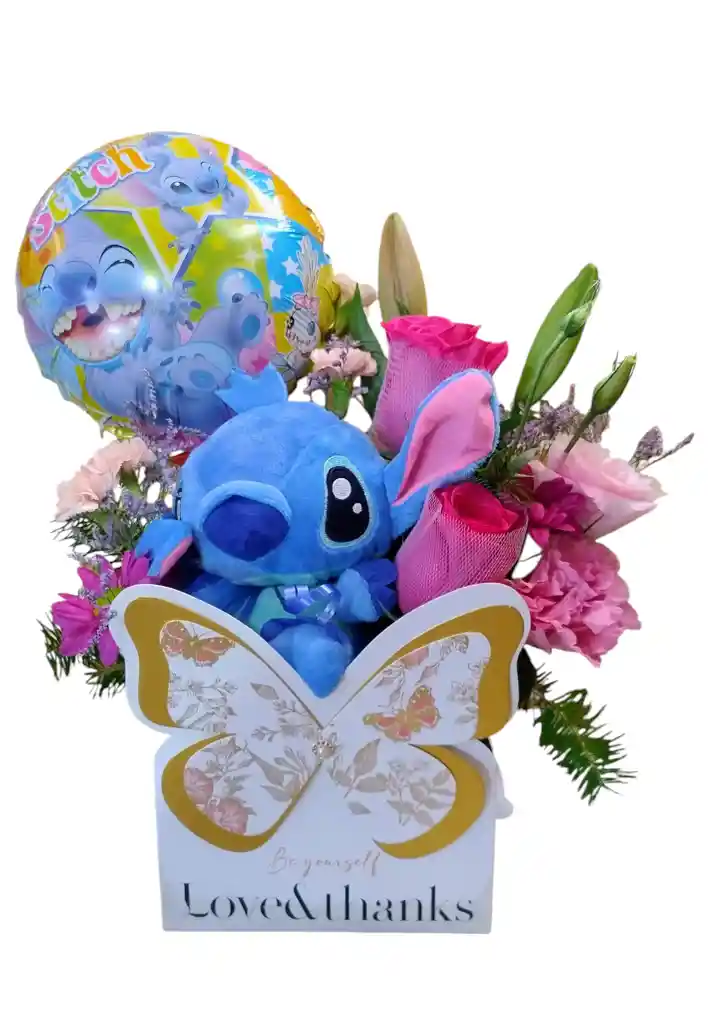 Caja mariposa con Stitch, globo del personaje, 2 rosas, 1 liliums, lisiantus y maules con follajes.