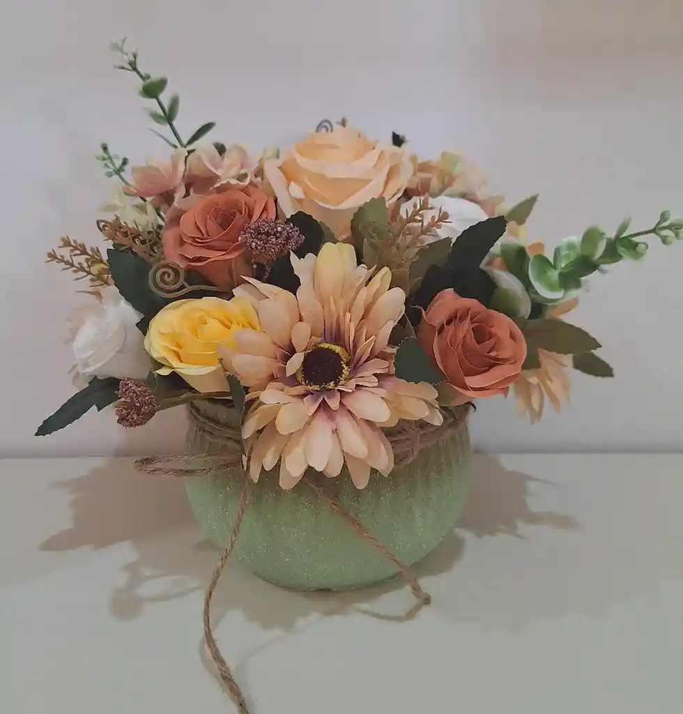 Arreglo en macetero de cerámica con estilo rústico, decorado con variedad de flores artificiales (rosas, peonías, ranúnculos, y más.. Según disponibilidad). Ideal para decorar el hogar o para regalar.