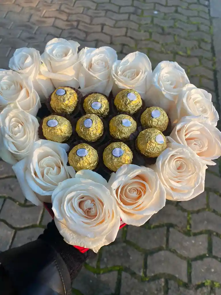 Arreglo floral rosas blancas con bombones ferrero Rosas de color Blanco ideal para el Condolencias