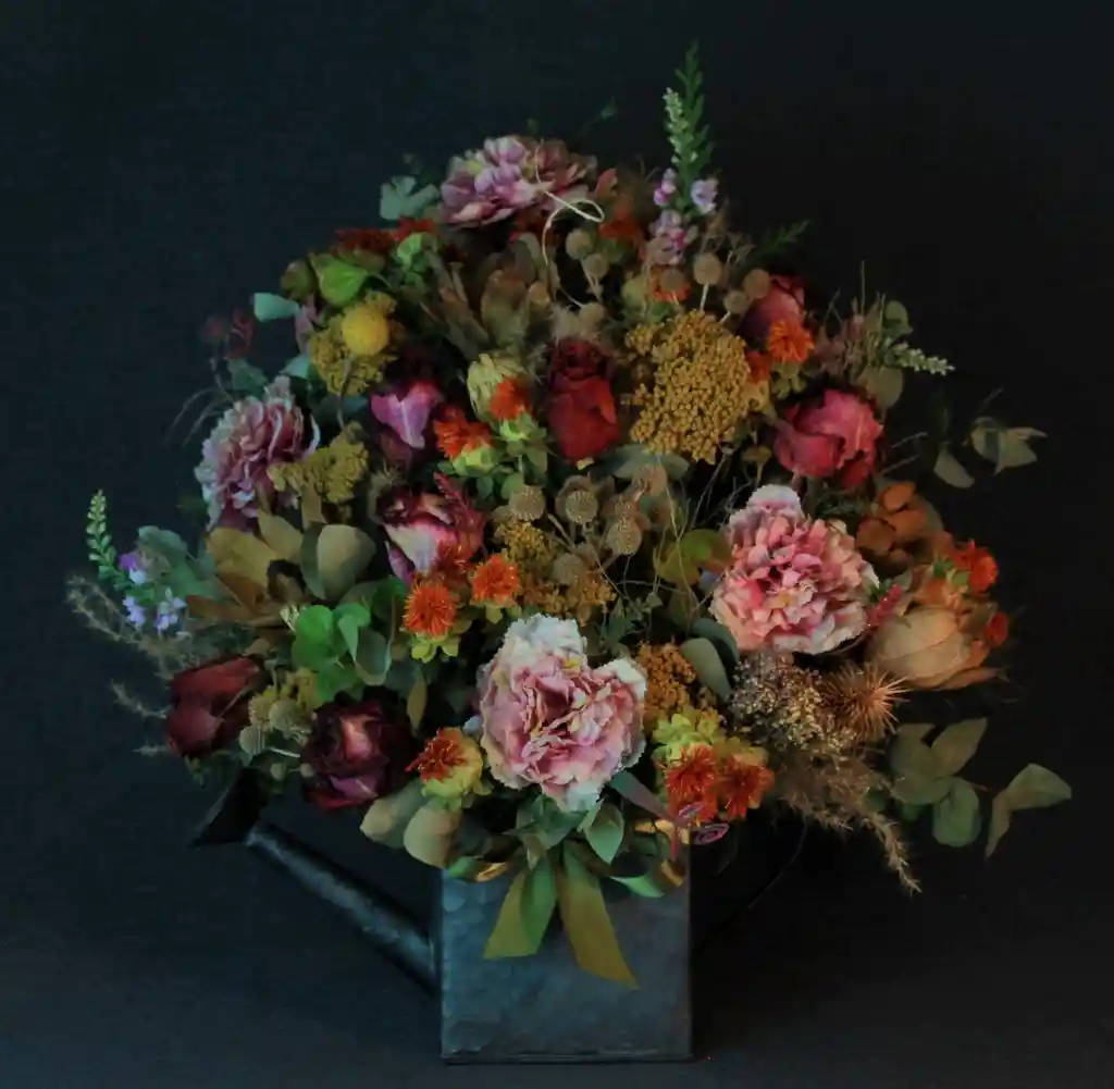 elegante arreglo con flores preservadas y de seda de 40 centímetros en regadera de zinc