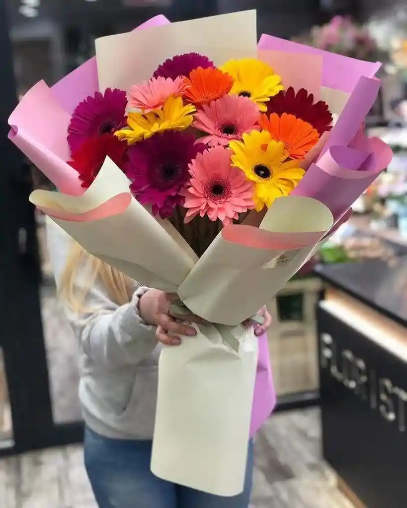 hermoso arreglo de mano con mix de 15 gerberas y delicado papel koreano