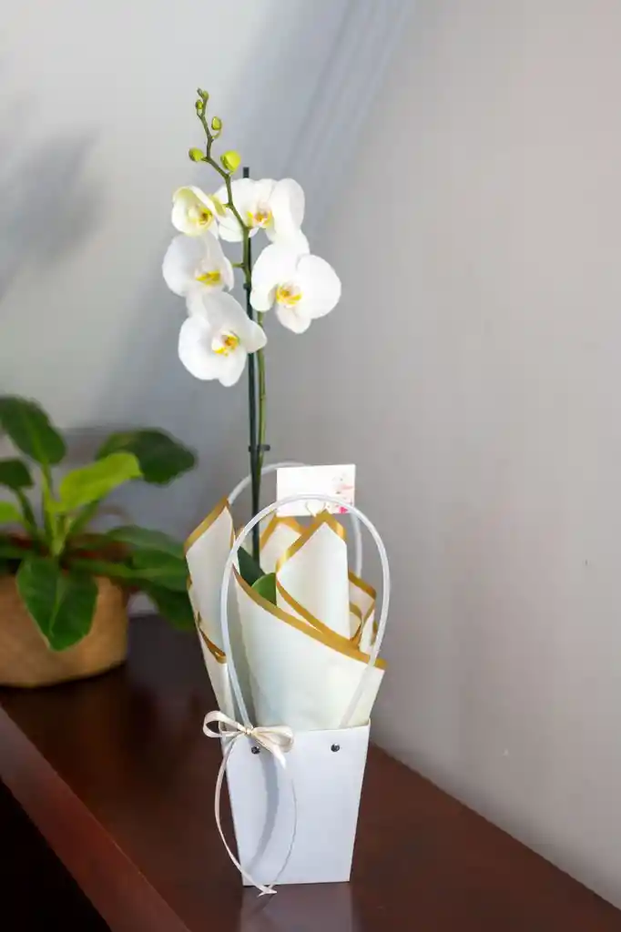Stellata: Un gesto de amor y respeto Orquídea blanca, símbolo de serenidad paz y amor. Acompañada de tarjeta de saludo. Un detalle sobrio y elegante para expresar afecto. Este arreglo incluye: 1 Orquídea blanca (de 1 o 2 varas según disponibilidad) en maceta transparente plástica Caja de cartón especial de florería color blanco Envoltura en ‘papel coreano’ Cinta Pin + tarjeta (deja tu saludo en “notas” al finalizar tu carrito)