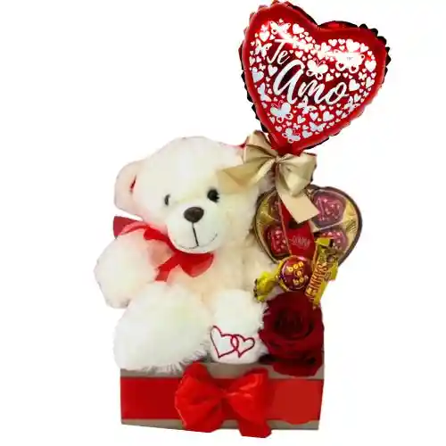 ARREGLO OSO 20CM 1 ROSA 1 CHCOLATES CORAZON 1 BOMBON Y GLOBITO