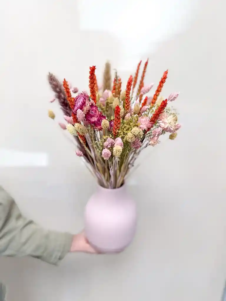 Incluye: Mix de flores secas holandesas en tonos naranjos, amarillos, rosados, beige y cafés Presentadas dentro de un Florero Rosado de Cerámica Altura aproximada 50 cms. Todos nuestros productos secos y preservados han sido cuidadosamente seleccionados e importados desde Holanda para ti. Además todos han sido cultivados, cosechados y producidos de manera manual para garantizar la mejor calidad y color, respetando las normativas eco-sustentables europeas. Nuestros productos pueden durar varios años si se cuidan de la manera correcta; evitando el sol directo, cambios de temperaturas muy abruptos, exposición a espacios húmedos, contacto directo con el agua, inadecuada manipulación, entre otros. *Por tratarse de un producto natural, al igual que nuestros ramos de flores frescas, nunca habrán dos ramos exactamente iguales.