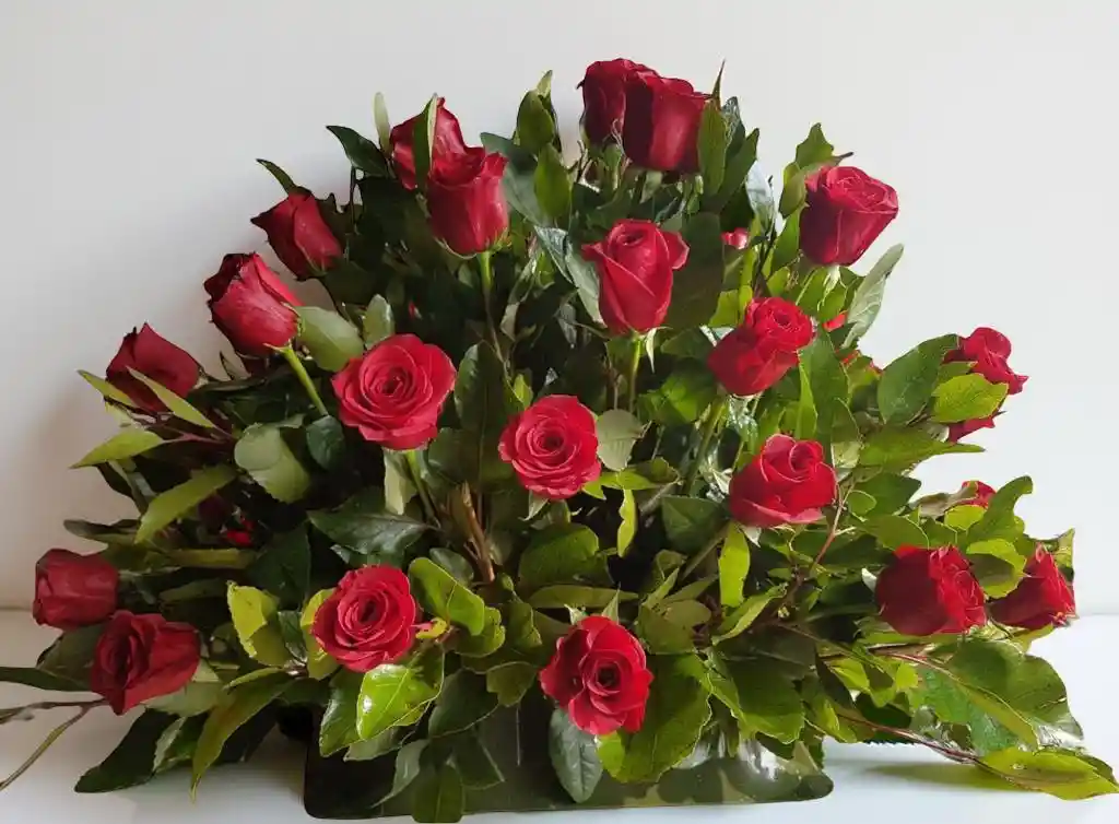 HERMOSO ARREGLO REDONDO 50 ROSAS ROJAS PARA DESPEDIR A LAS PERSONAS QUE ESTIMAMOS