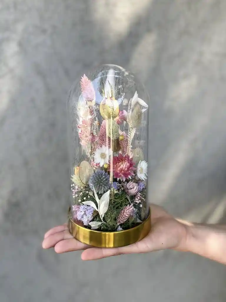 Por ser creado a mano, nos demoramos 2 días hábiles desde la compra en tenerlos listos para entrega. Este arreglo está creado 100% a mano dentro de un Fanal de Vidrio con base dorada y un mix de flores secas y preservadas Holandesas en tonos rosados, blancos, fucsias, beiges y cafés. Alto 19 cms y Ancho 9 cms aprox. *Por ser creado a mano no existen dos iguales. Todos nuestros productos secos y preservados han sido cuidadosamente seleccionados e importados desde Holanda para ti. Además todos han sido cultivados, cosechados y producidos de manera manual para garantizar la mejor calidad y color, respetando las normativas eco-sustentables europeas. Nuestros productos pueden durar varios años si se cuidan de la manera correcta; evitando el sol directo, cambios de temperaturas muy abruptos, exposición a espacios húmedos, contacto directo con el agua, inadecuada manipulación, entre otros. *Por tratarse de un producto natural, al igual que nuestros ramos de flores frescas, nunca habrán dos ramos exactamente iguales.