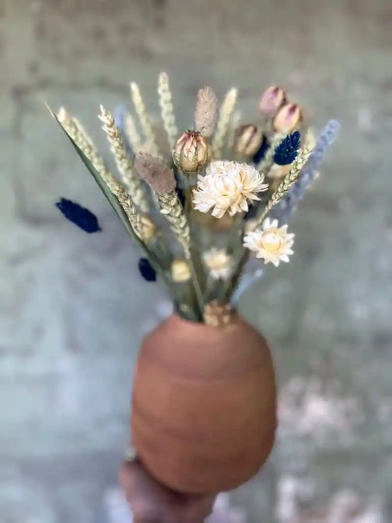 Este pequeño arreglo de flores secas es ideal para aquellas personas que tienen un estilo rústico y elegante. Incluye un mix de flores secas holandesas en tonos azules, celestes, blancos y beige presentadas dentro de un florero de terracota. Altura aproximada del arreglo 30 cms. Algunas flores pueden variar levemente. Todos nuestros productos secos y preservados son exclusivos y vienen directamente desde Holanda. *Por tratarse de un producto natural, al igual que nuestros ramos de flores frescas, nunca habrán dos ramos exactamente iguales.