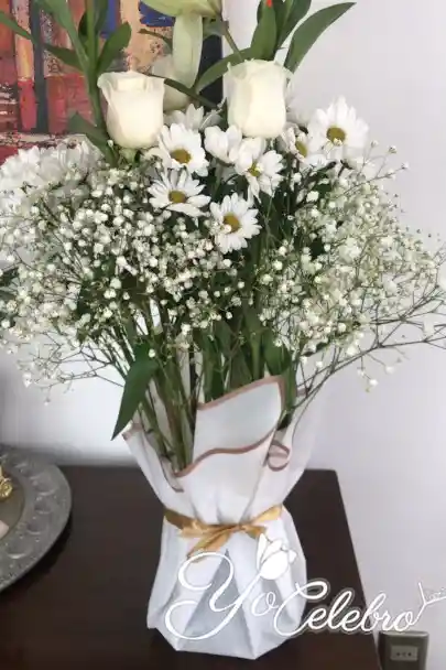 Arreglo tonos blancos Opcional, tarjeta con mensaje (indíquelo) sin costo adicional. Opcional, cinta de tela grabada con nombre (indique nombre) sin costo adicional. Todo envuelto en un hermoso papel