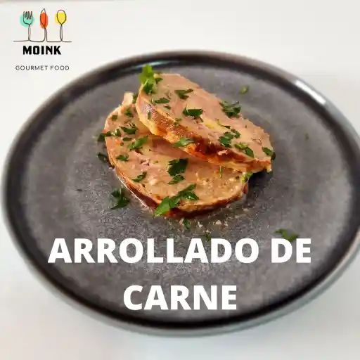 Arrollado de carne relleno de jamón, queso gauda, queso cheddar y salame envuelto en Tocino y salsa BBQ 300 gr