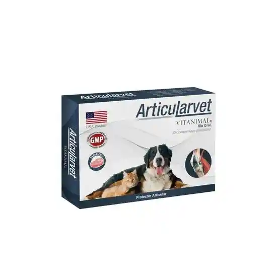 Hemolivet Vitanimal es ARTICULARVET Articularvet es un potente condroprotector 100% natural, cuya fórmula combina componentes activos que participan en el tratamiento de problemas articulares como; Artritis y artrosis, siendo además un coadyuvante en procesos degenerativos y cirugías traumatológicas, ya que esta formulado para proteger las articulaciones, disminuir el dolor y devolver la facilidad de movimiento a nuestros pacientes. Posología Perros: 1 comprimido cada 15 Kg. de peso, 1 vez al día, por al menos 60 dias. Gato: 1/4 comprimido al día. Origen Articularvet Vitanimal es fabricado en estados unidos, superando todos los estándares de calidad que este país exige para su producción. Contraindicaciones Al ser un producto 100% natural, no posee contraindicaciones, y asimismo se puede dar por largos periodos sin interferir con otros tratamientos. Presentación 30 Comprimidos palatables.un producto 100% natural, cuya fórmula combina componentes activos que participan en el metabolismo y regeneración de células sanguíneas, que lo convierte en un potente aliado frente a patologías relacionadas con anemias o enfermedades del sistema circulatorio.