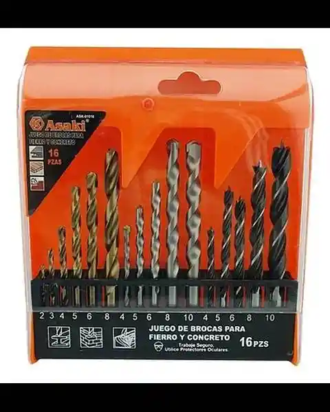 Set Contiene 16 Unidades. Para Madera (4-5-6-8-10 mm) Para Concreto (5-6-8-10 mm) Para Metal (2-3-4-5-6-8 mm).