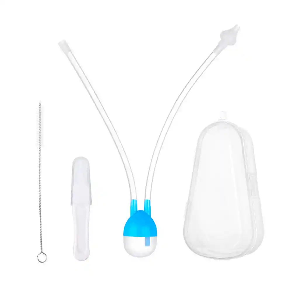 Material: Silicona Tamaño: 21 cm x 3,2 cm aprox Color: Celeste Paquete: 1 aspirador Nasal, 1 pinza, 1 cepillo limpiador Cada componente es fácil de desmontar y limpiar Tamaño ligero y portátil El tubo es suave y seguro