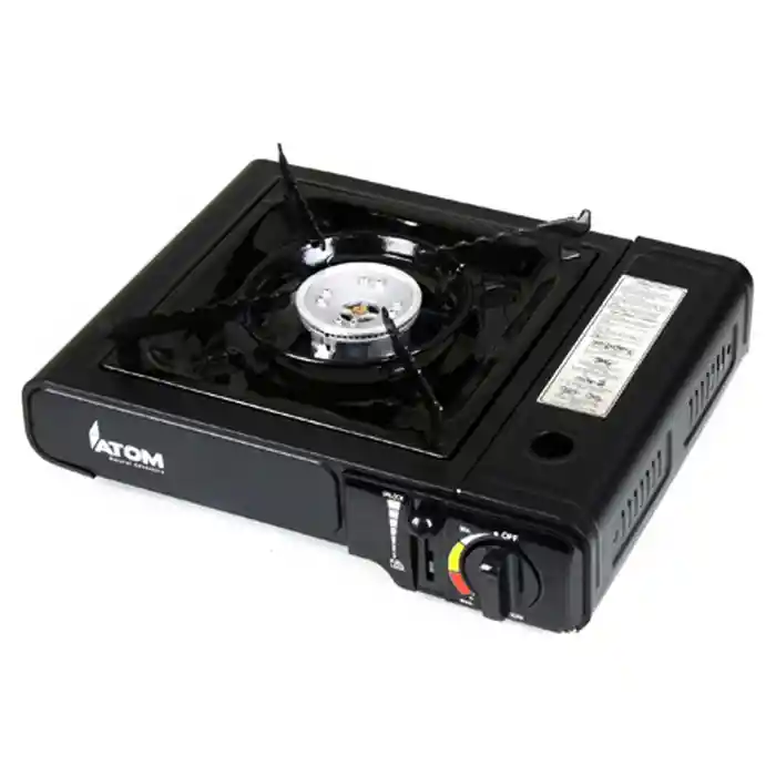 Cocinilla de Camping con grill y maleta de transporte, compatible con cualquier gas de 227 con valvula tipo 1. Regulador de llama, aro cortaviento, encendido automatico con sistema de seguridad. Consumo de gas de 160 gr por hora. Tiempo mínimo de consumo 1hr 40 min por gas.