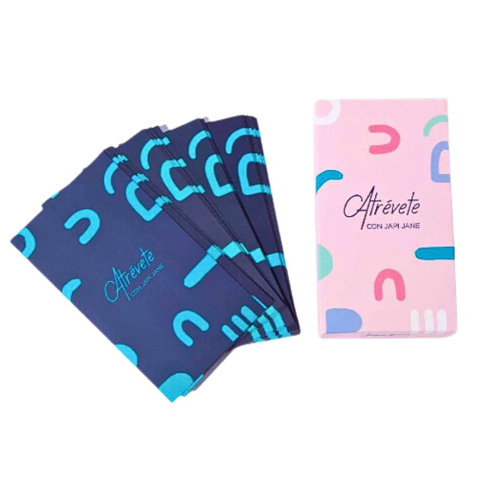 <p class="MsoNormal" style="margin: 0cm; margin-bottom: .0001pt;">“Atrévete” es un juego de 75 tarjetas pensadas para hablar de sexo. Así de simple.</p> <p class="MsoNormal" style="margin: 0cm; margin-bottom: .0001pt;"> </p> <p class="MsoNormal" style="margin: 0cm; margin-bottom: .0001pt;">Las preguntas buscan conocer tus propias experiencias, tus deseos y opiniones respecto a la sexualidad y están muy pero muy interesantes y entretenidas. Con algunas te reirás y con otras reflexionarás. Algunas te traerán sabrosos recuerdos y otras te dejarán de seguro con “tarea pa´ la casa”.</p> <p class="MsoNormal" style="margin: 0cm; margin-bottom: .0001pt;"> </p> <p class="MsoNormal" style="margin: 0cm; margin-bottom: .0001pt;">Se puede jugar compartiendo las preguntas entre quienes quieran: en pareja, en grupo de amigos, con quien quieras. Si estás en un carrete, en una despedida de soltera, en una cita romántica o en la situación que se te ocurra puedes sacar las tarjetitas y comenzar a preguntar.</p> <p class="MsoNormal" style="margin: 0cm; margin-bottom: .0001pt;"> </p> <p class="MsoNormal" style="margin: 0cm; margin-bottom: .0001pt;">Es un juego muy versátil, porque puedes jugarlo en la mesa, en la cama, con o sin ropa, sentado, acostado, entre cuatro paredes o al aire libre. </p> <p class="MsoNormal" style="margin: 0cm; margin-bottom: .0001pt;"> </p> <p class="MsoNormal" style="margin: 0cm; margin-bottom: .0001pt;">Incluye: 75 tarjetas.<br>Tarjetas Rosadas: Preguntas íntimas sobre tus deseos y fantasías.<br>Tarjetas Azules: Preguntas al grano sobre sexualidad.</p> <p class="MsoNormal" style="margin: 0cm; margin-bottom: .0001pt;"> </p> <p class="MsoNormal" style="margin: 0cm; margin-bottom: .0001pt;"> </p> <p class="MsoNormal" style="margin: 0cm; margin-bottom: .0001pt;">Preparamos cada producto Karmas en un precioso packaging con cintas de colores y lleno de detalles en su interior, para sorprender a tus más queridos o a ti misma.</p>