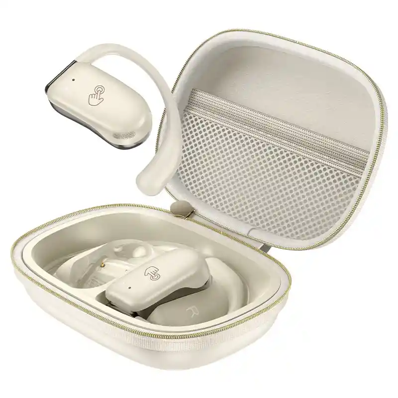 1. Versión BT: v5.3. Microprocesador: JL7006F4. 2. Protocolos soportados: Auriculares, Manos libres, A2DP, AVRCP. 3. Distancia de transmisión: 10 m. 4. Frecuencia de transmisión: 2,4Hz. 5. Unidad de altavoz: 16,2 mm. 6. Impedancia: 16Ω ± 15%. 7. Respuesta de frecuencia: 20-20000Hz. 8. Sensibilidad: 98dB ± 3dB. 9. Capacidad de la batería: estuche de carga 400 mAh, auriculares 60 mAh. 10. Entrada del estuche de carga: DC5V, tipo C. 11. Tiempo de carga: aproximadamente 2 horas para el estuche de carga, aproximadamente 1,5 horas para los auriculares. 12. Tiempo de conversación/música: 6 horas (80% volumen). Tiempo en espera: 280 horas. 13. Estéreo portátil abierto – OWS. Diseño de gancho para la oreja. 14. Admite cambio de líder-seguidor, activación de asistente de voz, cambio de canciones, reproducción/pausa de canciones. 15. Los auriculares se encienden automáticamente cuando se sacan del estuche de carga, emparejamiento automático. Los auriculares se apagan automáticamente cuando se colocan en el estuche de carga. 16. Pantalla de batería: compatible con teléfonos Apple y algunos teléfonos Android. 17. Tamaños: 106 × 80 × 39 mm. 18. Peso total: 97 g. Peso de un solo auricular: 11 g.