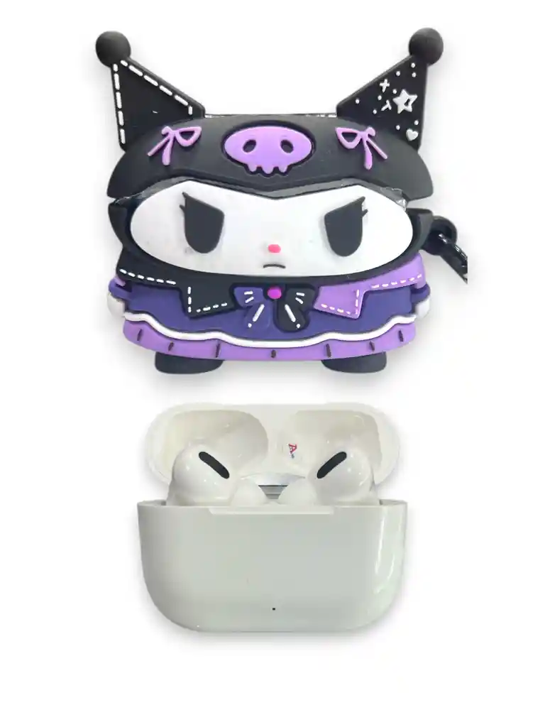 Audífonos Bluetooth con funda de silicona 3D de Kuromi en tonos negro y lila. Diseño divertido y protector, conexión estable y sonido envolvente de alta fidelidad. Incluye micrófono integrado para llamadas.