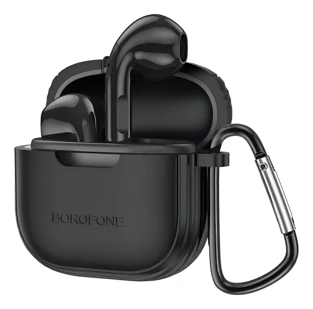 Auriculares Bluetooth con funda protectora de silicona negra y gancho metálico. Sonido equilibrado, micrófono manos libres y estuche magnético con luz LED.
