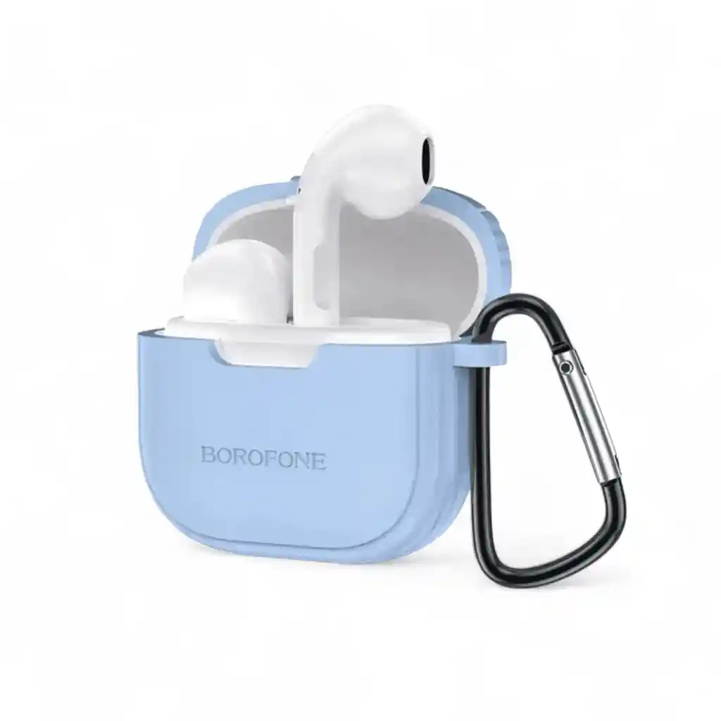 Audífonos bluetooth con estuche celeste, diseño compacto y sonido claro.