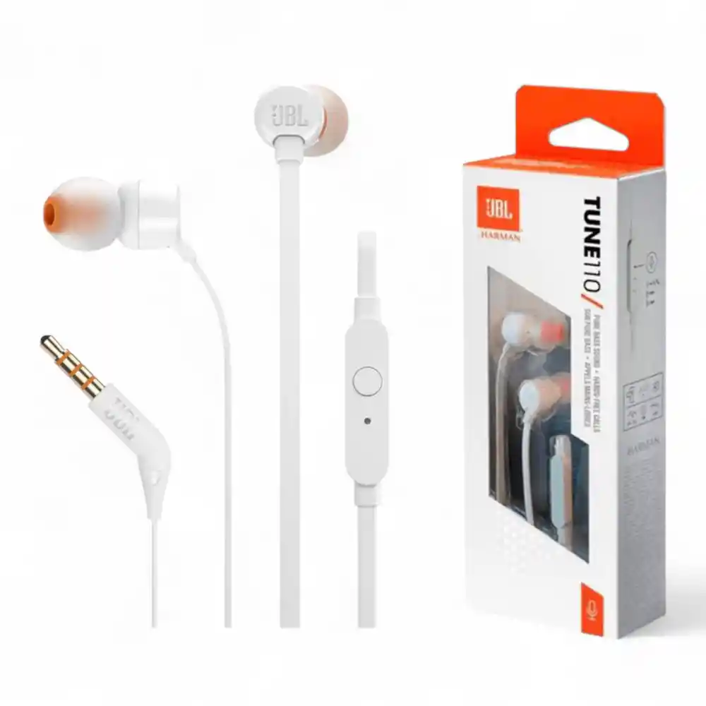 Audífonos cableados JBL Tune 110 blancos con bajos potentes, excelente calidad de sonido y control integrado para música y llamadas.