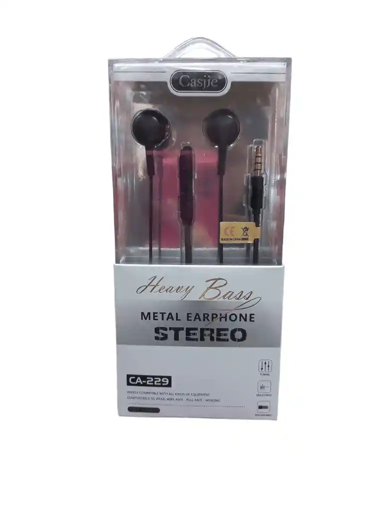 Auriculares metálicos color negro con sonido Heavy Bass, micrófono y cable anti-enredos. Perfectos para música con graves profundos.