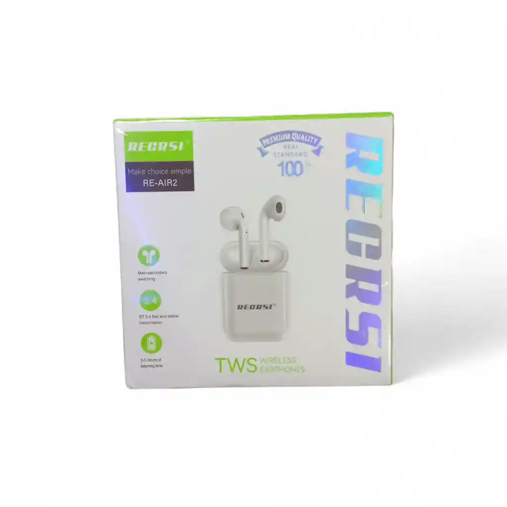 Audífonos inalámbricos TWS marca REGRSI con tecnología Bluetooth 5.4, conexión estable y estuche de carga compacto para uso diario.