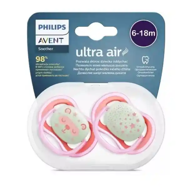 El Pack Chupetes Air Nocturno 6 18 Meses Niña Avent es el Complemento Perfecto Para tu Bebé. Con un Diseño Encantador de Animales y Estrellas Este Chupete no Solo es Funcional Sino También Adorable. Fabricado Con Materiales de Alta Calidad Este Chupete es Libre de Bpa lo Que Garantiza la Seguridad y el Bienestar de tu Pequeña. Además Cuenta Con Una Mamila de Silicone Anatómica Diseñada Para Adaptarse a la Boca de tu Bebé y Promover un Desarrollo Oral Saludable. el Pack Chupetes Air Nocturno 6 18 Meses Niña Avent También Incluye un Mango de Seguridad Que Evita Que el Chupete se Pierda o Caiga al Suelo. Así Podrás Estar Tranquila Sabiendo Que tu Bebé Siempre Tendrá su Chupete a Mano. Recomendado Para Bebês de 6 a 12 Meses Este Pack de Chupetes es Ideal Para Ayudar a tu Pequeña a Calmarse y Relajarse Durante la Noche. no Pierdas la Oportunidad de Brindarle a tu Bebé el Confort y la Tranquilidad Que se Merece Con el Pack Chupetes Air Nocturno 6 18 Meses Niña Avent.
