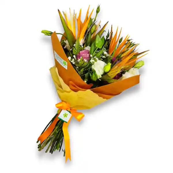 Hermoso ramo de aves del paraíso y lissianthus de colores mix, decorado con fino follaje