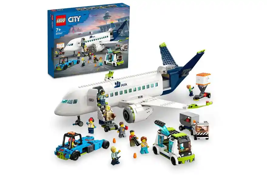 Un regalo especial para fans de las maquetas de aviones. El set 7+ LEGO® City Avión de Pasajeros (60367) cuenta con numerosas características y funciones de gran realismo. Este moderno avión de juguete tiene un detallado interior con cabina, asientos, pasillo y aseo, y viene con una escalera de embarque, un autobús de pista, un remolcador de aviones, un camión de catering, una cabeza tractora con carro portaequipajes y 9 minifiguras. Guía de construcción interactiva Este juego de juguetes cuenta con una guía visual de construcción impresa fácil de seguir e instrucciones 3D paso a paso en LEGO Builder, una app que permite a los peques acercar, girar y visualizar sus modelos, controlar el avance en el proceso de construcción y también explorar y guardar sets virtuales. Vehículos LEGO City Los niños crecen rodeados de asombrosos vehículos y máquinas; con los sets de construcción LEGO City, pueden explorarlos de cerca a través de modelos que guardan gran parecido con los de verdad. • Aeronave y vehículos de apoyo en tierra: El set de juguetes de construcción LEGO® City Avión de Pasajeros (60367) cuenta con detalles y funciones de gran realismo. • ¿Qué contiene la caja? Todo lo necesario para construir el Avión de Pasajeros, una escalera de embarque, un autobús de pista, un remolcador de aviones, un camión de catering y una cabeza tractora con carro portaequipajes, además de 9 minifiguras. • Características y funciones: Los niños pueden manejar el camión de catering para cargar la comida a bordo y quitar el techo del avión para acceder a la detallada cabina, los asientos, el pasillo, el aseo y la galería. • El sueño de los fans de los aviones de juguete: Un divertido regalo de cumpleaños para niños y niñas a partir de 7 años, perfecto también como obsequio en fechas festivas o cualquier otra ocasión. • Un montón de espacio para jugar: El Avión de Pasajeros de juguete mide aproximadamente 19 cm de altura, 47 cm de longitud y 44 cm de anchura. • Divertidos accesorios que amplían las posibilidades de juego: Incluye accesorios LEGO® de juguete para minifiguras, como una maleta, una cámara, una mochila, un maletín, un walkie-talkie, 2 latas de bebida y 2 tazas. • Una divertida experiencia de construcción interactiva: Con la app LEGO® Builder, disponible para smartphones y tabletas, los niños pueden acercar, girar y ver los modelos de este set desde todos los ángulos a medida que los construyen. • Juego creativo sin límites: Da rienda suelta a más diversión y aventuras combinando este set con otros de la gama LEGO® City. • Garantía de calidad: Todos los componentes LEGO® cumplen rigurosas normas del sector, por lo que ofrecen siempre las mismas cualidades, son compatibles entre sí y proporcionan una divertida experiencia de construcción. • Controles de seguridad: Los componentes LEGO® se dejan caer, se calientan, se aplastan, se retuercen y se analizan para verificar que satisfacen estrictos estándares mundiales de seguridad.