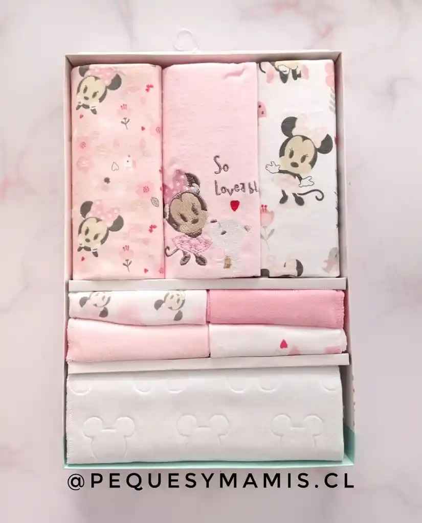 Set ideal para regalo con motivos de Baby Mickey, contiene: - 3 mantitas extra suaves, no raspan ni irritan, tamaño 76x76 cm - 8 Toallitas para bebé, suaves y absorbentes, múltiples usos, tamaño 23x23 cm - 1 Mudador impermeable, lavable, tamaño 46x69 cm