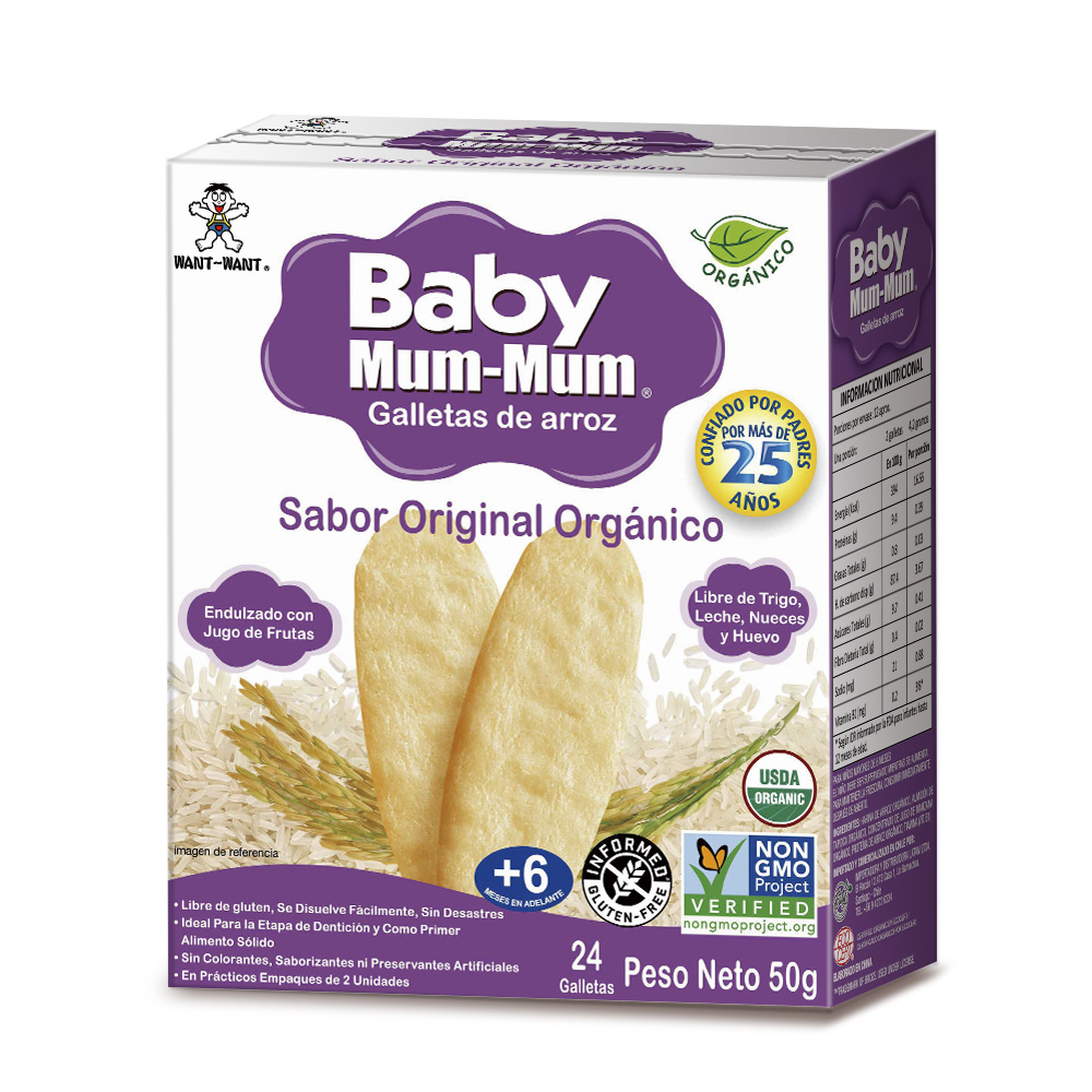 Snack saludable para bebés, endulzado con jugo de fruta natural, sin preservantes, colorantes, ni azúcar añadida y libre de sellos. Se disuelven fácilmente en la boca, ideales para la etapa de dentición y como primer alimento sólido. Libre de Gluten y de GMO. Orgánicas. Libre de los 10 alérgenos más comunes (Maíz, Soya, Crustáceos, Maní, Pescado, Trigo, Sésamo, Frutos Secos, Huevo y Leche). Recomendado a partir de los 6 meses de edad. Cada caja trae 12 sachets, cada uno con 2 galletas en su interior.