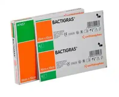 Bactigras es un apósito estéril de gasa parafinada (tejido de malla abierta) impregnada con acetato de clorhexidina al 0.5%, utilizado como capa de contacto en heridas para prevenir infecciones. Actúa como antiséptico de amplio espectro, es de baja adherencia para reducir el dolor al retirarlo y permite el drenaje de la herida.