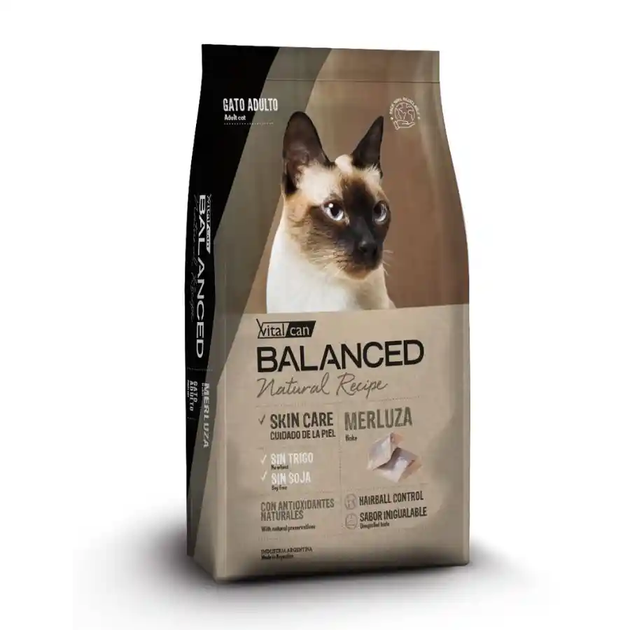 BALANCED NATURAL RECIPE MERLUZA. Receta monoproteíca a base de merluza que contribuye a reducir las reacciones alérgicas a otras fuentes de proteína. El plus de Omega3 ayuda a mejorar la condición de la piel y los signos digestivos de la intolerancia alimentaria. DIGESTIVE HEALTH: Con el agregado de fibras saludables, yucca schidigera y zeolita que favorecen el proceso digestivo y ayudan a disminuir olores. OMEGA 3 PLUS: Con aceite de pescado, fuente de omega 3, que contribuye a mantener la salud intestinal y cutánea. URINARY HEALTH: Su balance de proteínas y minerales colaboran en alcanzar un pH urinario óptimo manteniendo un tractor urinario saludable. HEALTHY JOINTS: Con glucosamina y metilsufonilmetano, que ayudan a proteger el sistema osteoarticular del gato adulto, ya que colaboran con la regeneración y protección de cartílago articular.
