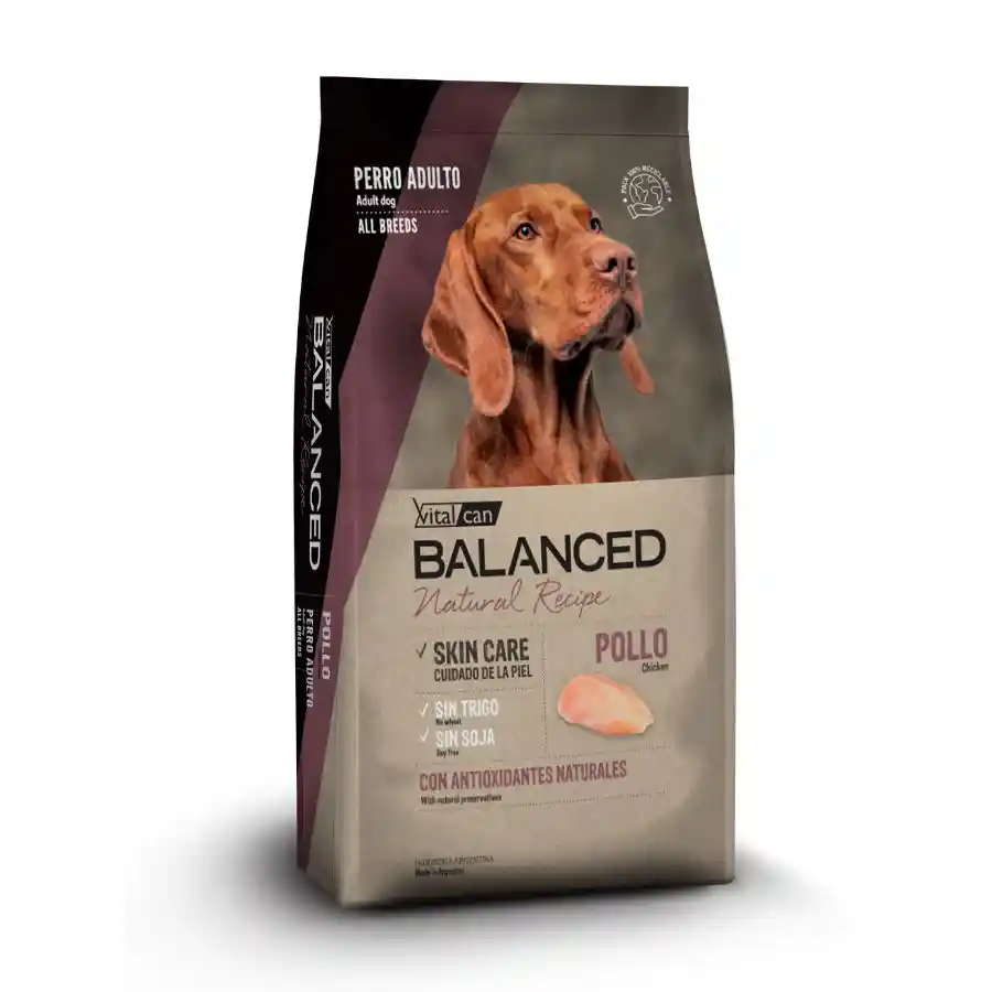 BALANCED NATURAL RECIPE POLLO. Receta monoproteíca a base de pollo de gran digestibilidad que contribuye al óptimo desarrollo de la masa muscular. El plus de Omega 3 contribuye a mantener la salud intestinal y cutánea. SKIN CARE: Balance de Omega 3 y 6, ácidos grasos esenciales fundamentales para ayudar a mantener una piel sana, humectada y un pelaje brillante. ORAL CARE: Con el agregado de hexametafosfato para ayudar a prevenir el desarrollo de sarro dental. DIGESTIVE PROTECT: Los prebióticos favorecen el desarrollo de bacterias benéficas del intestino, lo que contribuye a mejorar la absorción intestinal, lograr un proceso digestivo óptimo y aumentar las defensas naturales. HEALTHY JOINTS: Con glucosamina y metilsulfonilmetano, que ayudan a proteger el sistema osteoarticular del perro adulto, ya que colaboran con la regeneración y protección del cartílago articular.