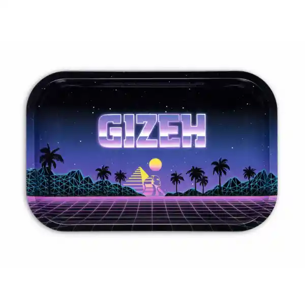 Bandeja Gizeh Metálica Moon Light tamaño mediano (28 × 18 cm). Fabricada en metal resistente con diseño de pirámides sobre fondo azul y logo central. Superficie lisa ideal para preparar y organizar accesorios con comodidad.