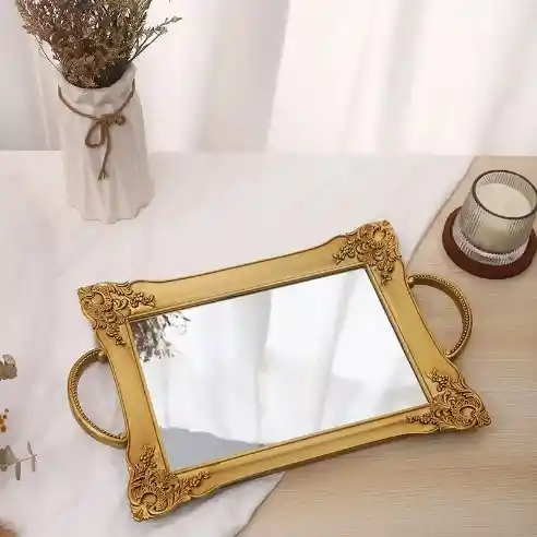 Bandejas decorativas doradas con espejo y detalles moldeados. Perfectas para una decoración sofisticada y funcional.