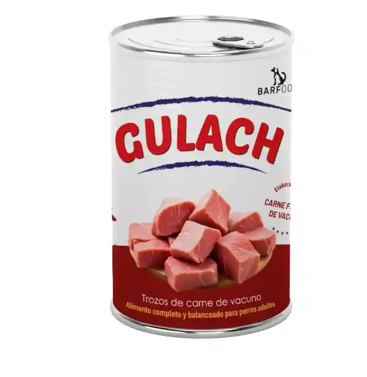 Gulach de Vacuno 400 gramos de trozos de carne de vacuno. Alimento completo y balanceado para perros adultos. Ingredientes: 79% carne y productos cárnicos, (Min. 8% Vacuno), productos vegetales, Vitaminas y Minerales. Modo de uso: Tener agua disponible todo el tiempo, antes de abrir almacenar en un lugar fresco y seco, después de abrir almacenar en un envase hermético, mantener refrigerado y consumir en las siguientes 72 horas.