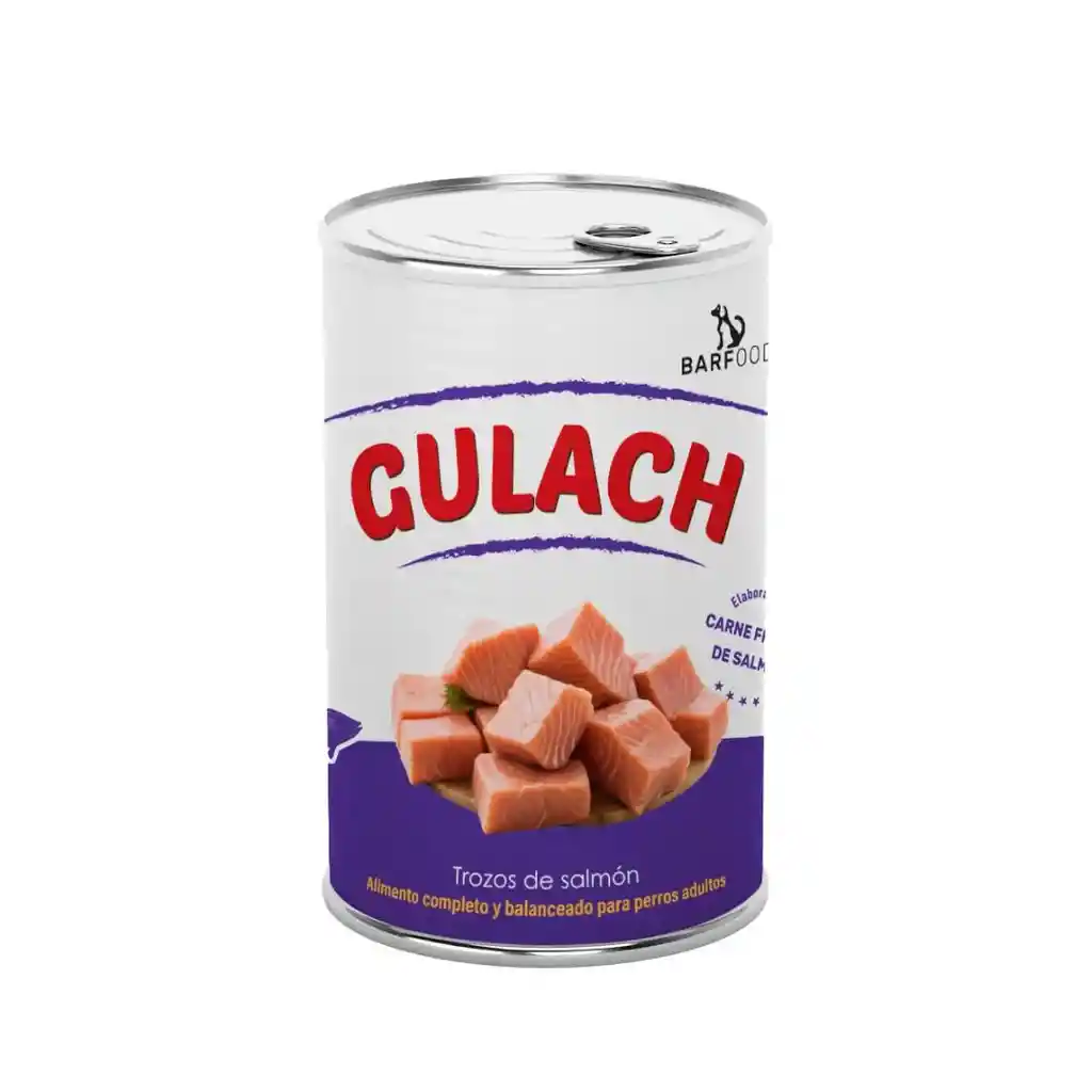Gulach de Salmón 400 gramos de trozos de carne de salmón. Alimento completo y balanceado para perros adultos. Ingredientes: 79% carne y productos cárnicos, (Min. 8% Salmón), productos vegetales, Vitaminas y Minerales. Modo de uso: Tener agua disponible todo el tiempo, antes de abrir almacenar en un lugar fresco y seco, después de abrir almacenar en un envase hermético, mantener refrigerado y consumir en las siguientes 72 horas. Este producto lo puedes combinar con su comida deshidratada para perros Barfood.