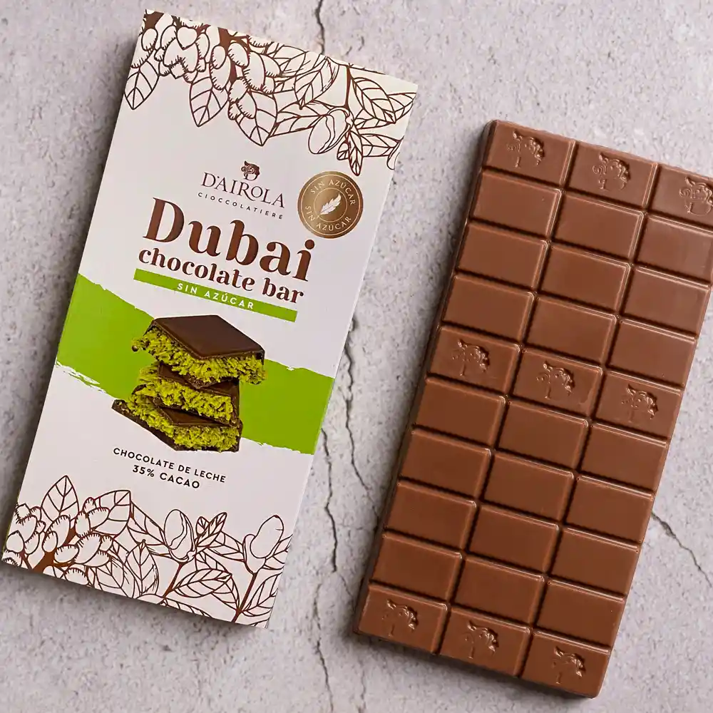 Exquisita barra de chocolate de leche 35% cacao sin azúcar, rellena con nuestra pasta de pistachos tostados artesanal y kataifi crujiente. 110 gramos.