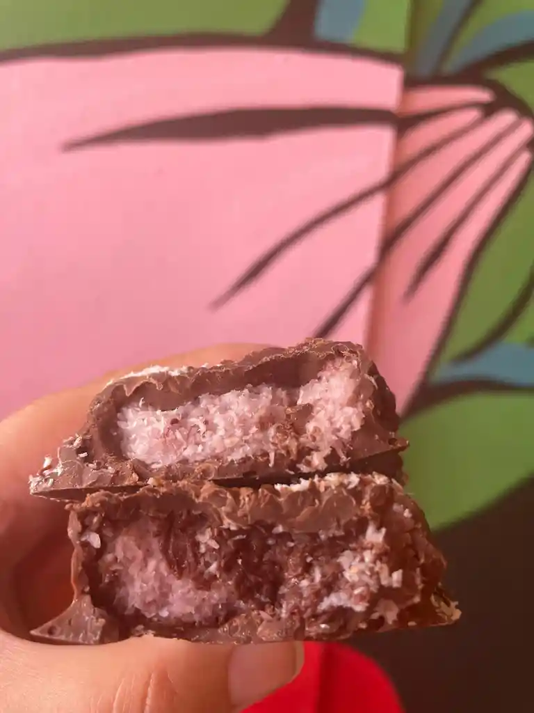 Hecha a base de coco, dulce de fresas sin azúcar, alulosa, yogurt de coco y chocolate sin azúcar.