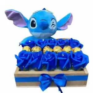 Base de 10 Rosas Eternas Azules, 6 Bombones y Peluche Stitch