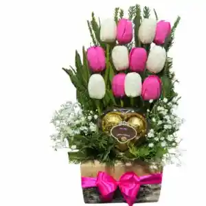 Base de 12 Tulipanes Blancos y Fucsias Eternos y Bombones Corazón