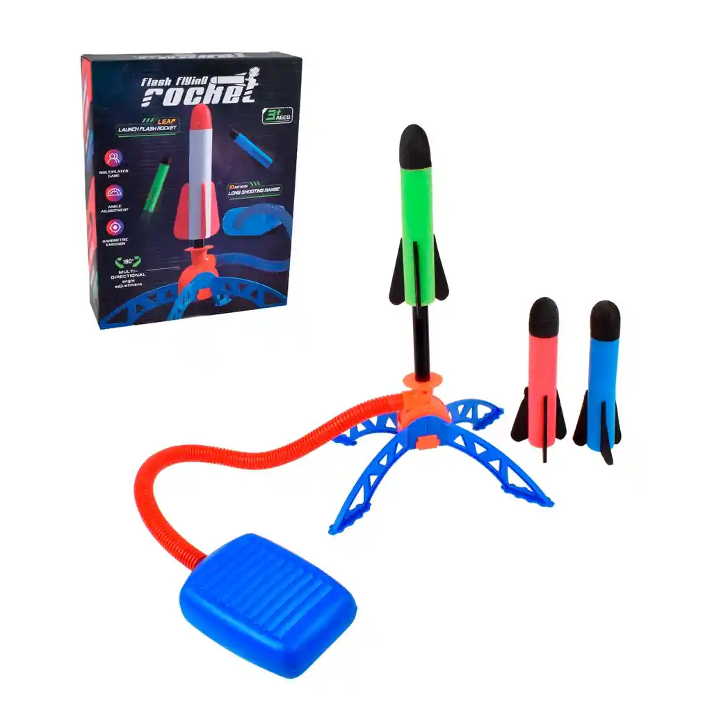 El lanzador de cohetes Flying Rocket es un juguete ideal para niños de 3 años en adelante. Este lanzador es un juguete seguro y divertido que permite simular el lanzamiento de cohetes de manera realista. El lanzador está fabricado con materiales resistentes y tiene un diseño ergonómico que facilita su manejo, el sistema de lanzamiento es simple e intuitivo, y permite lanzar los cohetes a varios metros de altura. El kit incluye 3 cohetes de espuma, que son suaves y seguros para el niño, teniendo cada uno de ellos tienen una forma aerodinámica que los hace atractivos. Este lanzador es un juguete ideal para jugar al aire libre o dentro de la casa, es una excelente manera para que los niños exploren la ciencia y la tecnología, y se diviertan al mismo tiempo. Además de ofrecer una infinidad de entretenimiento, también ofrece beneficios ya que permite simular el lanzamiento de cohetes de manera realista, favorece el desarrollo motriz, la coordinación mano/ojo, y el equilibrio, así como fomentar el juego de rol a través de la imaginación y la creatividad.