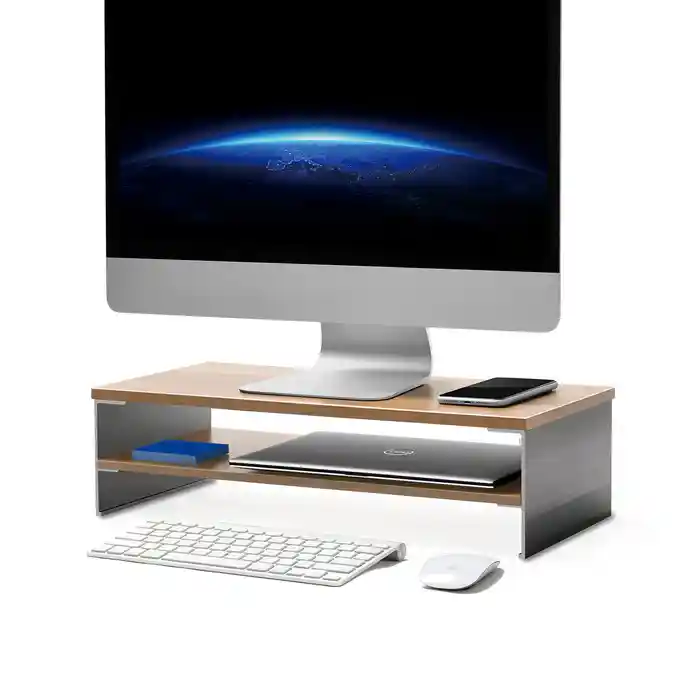 Soporte / Base de Monitor para Escritorio Nuestro soporte ergonómico para monitor de computadora mantiene su pantalla a una altura cómoda al nivel de los ojos, mejora efectivamente la postura para aliviar la fatiga visual y prevenir el dolor de espalda y cuello en todo el días de trabajo. La mayor longitud de la tabla le permite tener más espacio de almacenamiento. El tablero de 12 mm de espesor es estable en estructura, resistente al desgaste. Dimensiones generales: 50 cm de largo x 24 cm de ancho x 13.8 cm de alto. Este elevador de soporte para monitor está diseñado para proporcionar un espacio de almacenamiento de 2 niveles (nivel inferior: 52 mm, nivel superior: 64 mm) para sus notas, archivos, anteojos, mouse, teclado, parlantes, etc. Este elevador de monitor se puede usar como soporte de escritorio (carga de hasta 10 kg), soporte de impresora, soporte para computadora portátil, soporte elevador de monitor o soporte de computadora, accesorio de organización de escritorio perfecto para uso doméstico y de oficina. Hecho de material MDF mate ecológico y de calidad. Con la superficie lisa y exquisitamente pulida, los pies de aleación de aluminio sólido permiten que este soporte admita todo tipo de monitores, computadoras portátiles, tabletas, este elevador de monitor le ofrece un elevador de monitor de computadora elegante y duradero. Las instrucciones de este elevador de soporte para monitor son claras y fáciles de seguir, por lo que el ensamblaje toma solo unos minutos. El soporte del monitor incluye pies de goma suave, lo que garantiza que su monitor esté perfectamente estabilizado en su escritorio y que el escritorio no se raye. Todas las ventajas * Pantalla a la altura de los ojos * Diseño ergonómico * Lugar de trabajo organizado * Madera y aluminio de alta calidad Dimensiones Longitud: 24 cm Ancho: 50 cm Altura: 13.8 cm Material: Madera y Aluminio Peso: 2.28 KG Largo del Cable: 1.5 Mts Todas las ventajas * Pantalla a la altura de los ojos * Cuatro puertos USB (2.0) * Diseño escandinavo * Lugar de trabajo organizado * Aluminio de alta calidad * Construcción robusta