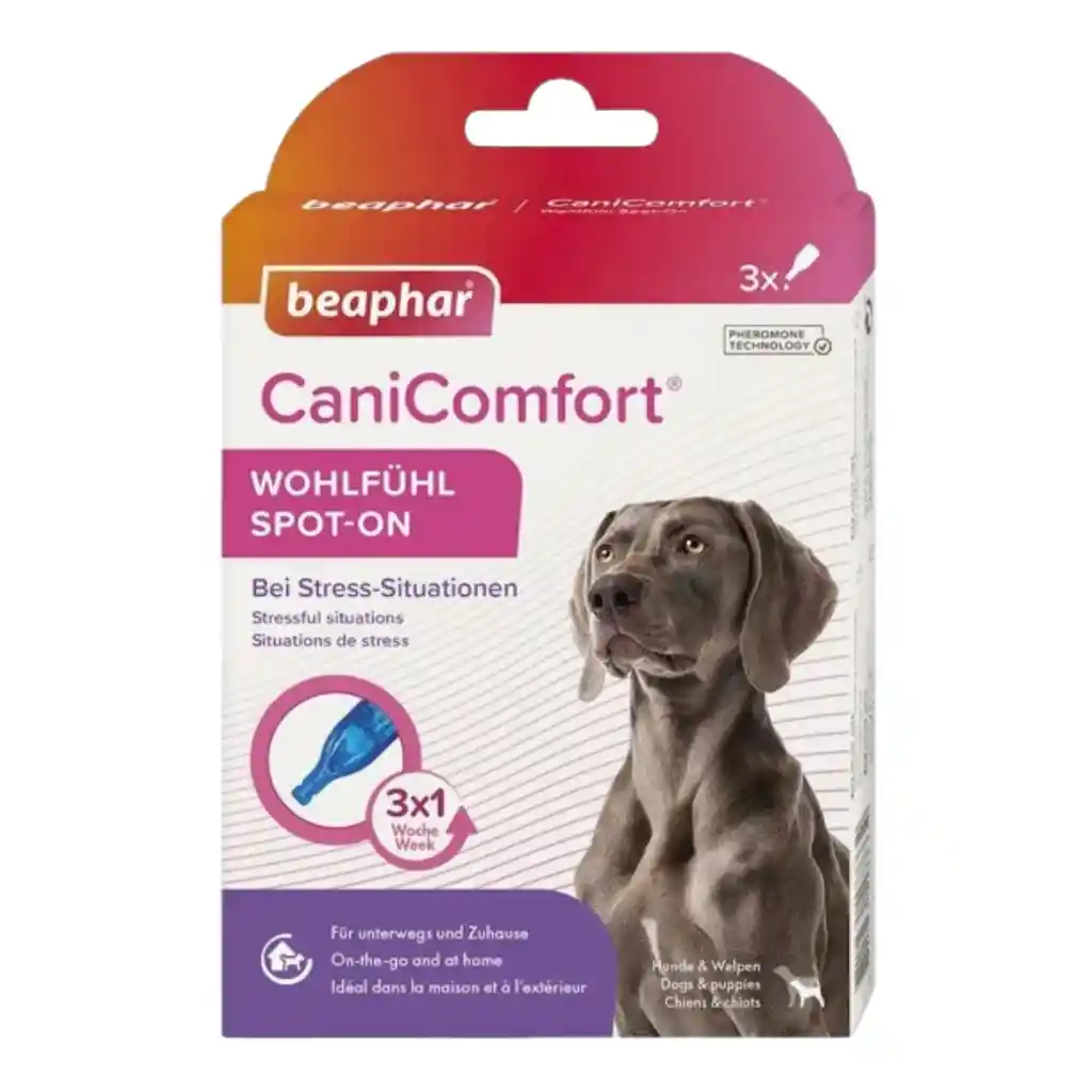 Pipeta calmante para perros de todas las razas y edades. Con feromonas sintéticas: la imitación de feromonas familiares producidas por la madre durante la lactancia tiene un efecto calmante. Puede reducir comportamientos no deseados: como ladridos fuertes, destrucción de muebles, arañazos en el hogar. Ideal en situaciones de estrés: ayuda a los perros a relajarse y a sentirse seguros y protegidos. Para casa y de viaje: para el estrés causado por mudanzas, tormentas eléctricas, fuegos artificiales, encuentros con otros perros, quedarse solo, etc. Puede ayudar a prevenir las enfermedades caninas relacionadas con el estrés. Presentación: 3 pipetas de 1 ml. ¿Cómo ayuda Beaphar CaniComfort® a tu perro? Los productos Beaphar CaniComfort® ayudan a crear un entorno tranquilo y sin estrés. La feromona de los productos Beaphar CaniComfort® es una copia de la feromona apaciguadora canina (feromona materna). Cuando una perra está amamantando a sus cachorros, esta feromona proporciona un mensaje instintivo de tranquilidad y ayuda a los cachorros a sentirse seguros y tranquilos. Por lo tanto, cuando los cachorros pasan del criador a un nuevo propietario, la feromona puede ayudar al cachorro en situaciones nuevas (emocionantes) como el traslado a un nuevo propietario, la socialización y el adiestramiento. Esta feromona, también funciona en los perros adultos, asegurando que el perro se sienta más tranquilo y pueda relajarse. ¿CaniComfort® hará que mi perro tenga sueño? No, tu perro no tendrá sueño con Beaphar CaniComfort®. No es un producto sedante, CaniComfort® es una copia de la feromona materna y eso tranquilizará al perro sin adormecerlo. Tampoco debes temer que su perro parezca relajado pero siga estresado en su interior, esto no ocurre con CaniComfort®. Beaphar CaniComfort® Calming Spot-On es adecuado para perros de todas las razas desde el momento en que abandonan la camada. Es ideal para ayudar a mantener la calma de su perro cuando está fuera de casa y es especialmente útil cuando viaja o pasa tiempo en las perreras. El envase contiene 3 viales. El efecto de cada vial dura hasta una semana. Modo de uso: Aplicar el contenido de una pipeta y dejar secar. Tenga cuidado de aplicar Beaphar CaniComfort® Calming Spot-On en un lugar diferente a un producto antipulgas, idealmente en la parte superior de la cabeza de su perro, entre las orejas. Si su perro se moja mucho, como cuando llueve mucho o después de un baño, el efecto puede disminuir. No lo use en piel dañada o rota. No conservar por encima de 25 ° C. Guardar en un lugar seco. Manténgase fuera del alcance y de la vista de los niños. El efecto de cada aplicación puntual dura hasta 1 semana. Vuelva a aplicar según sea necesario. Composición: Análogo de feromona apaciguadoras para perros (DAP) ........... 2% Etoxidiglicol q.s ......................................... 1ml 3